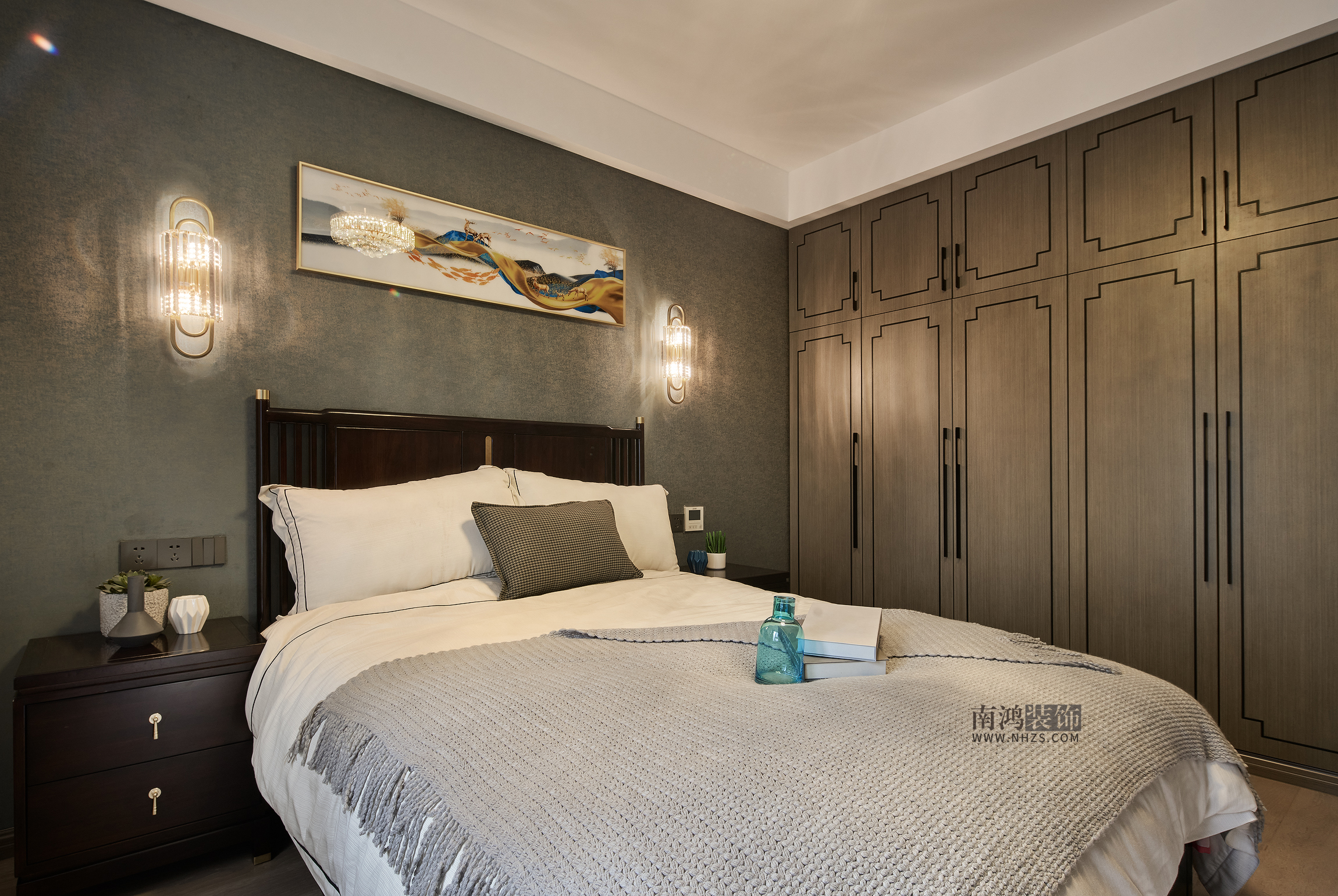 背景墻采用布藝硬包結(jié)合定制壁畫(huà),層次感豐富