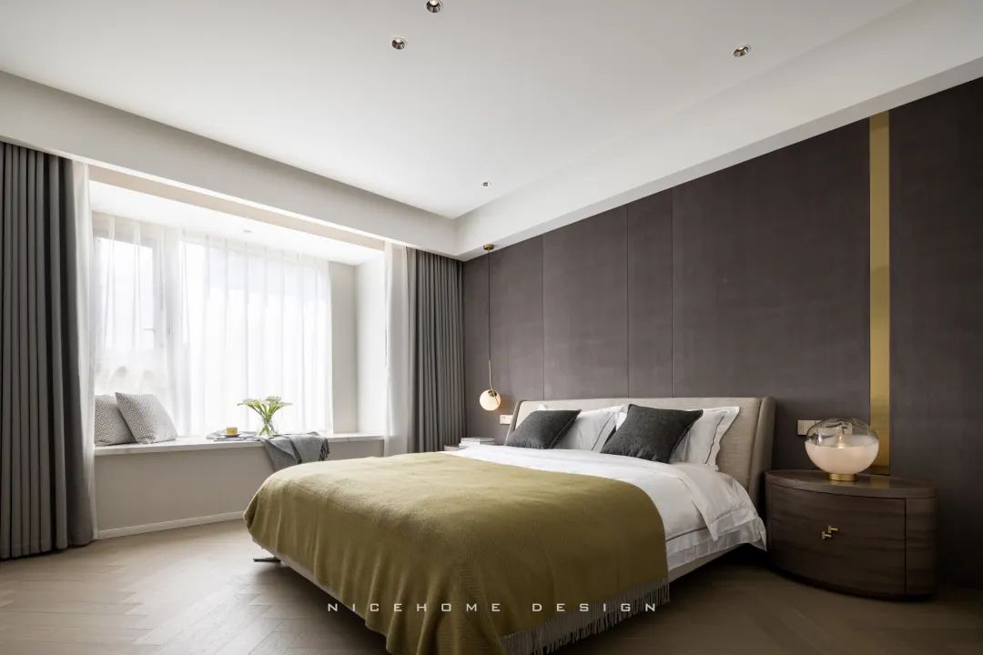 主臥是包含衛(wèi)浴與衣帽間在內(nèi)的大套房,睡眠區(qū)做深咖色硬包背景,延續(xù)整體簡約的基調(diào)。設計順應人居舒適感而作,照進室內(nèi)的光化身一支妙筆,勾勒出層層質(zhì)感。