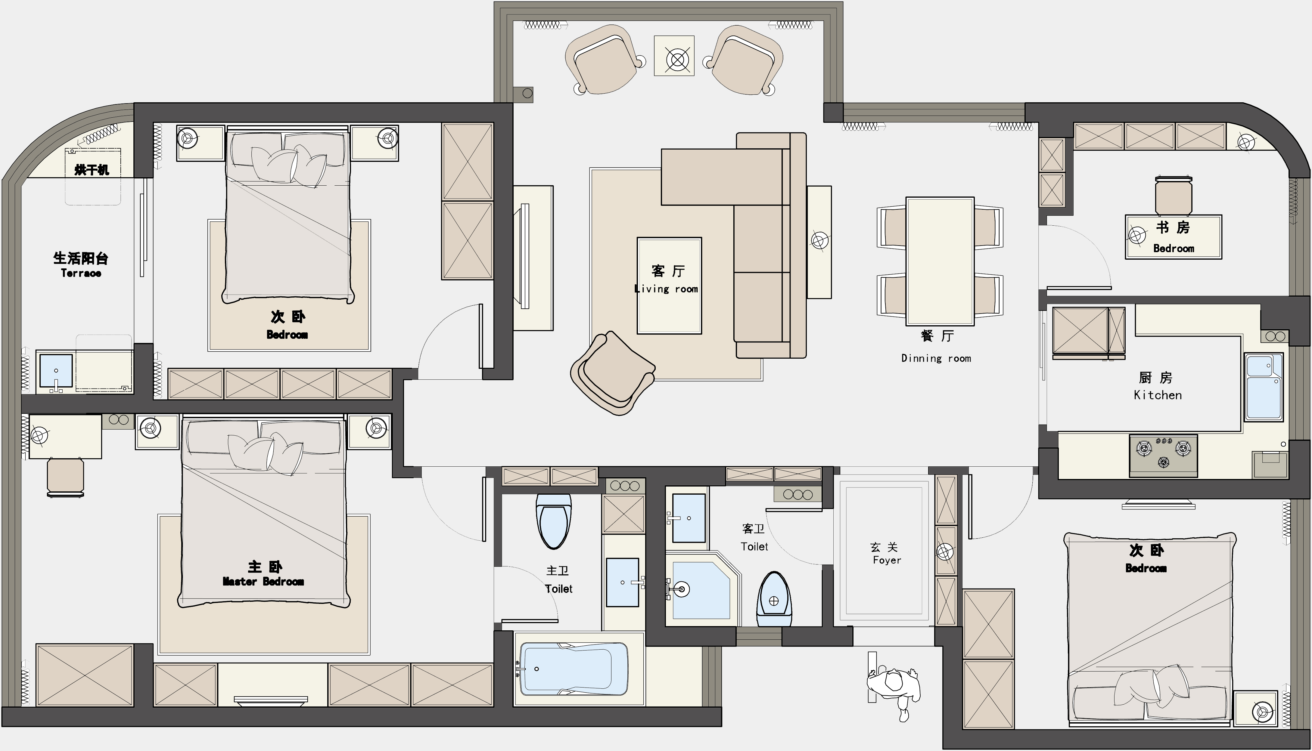 主臥床尾做整排的儲物柜來增加收納空間