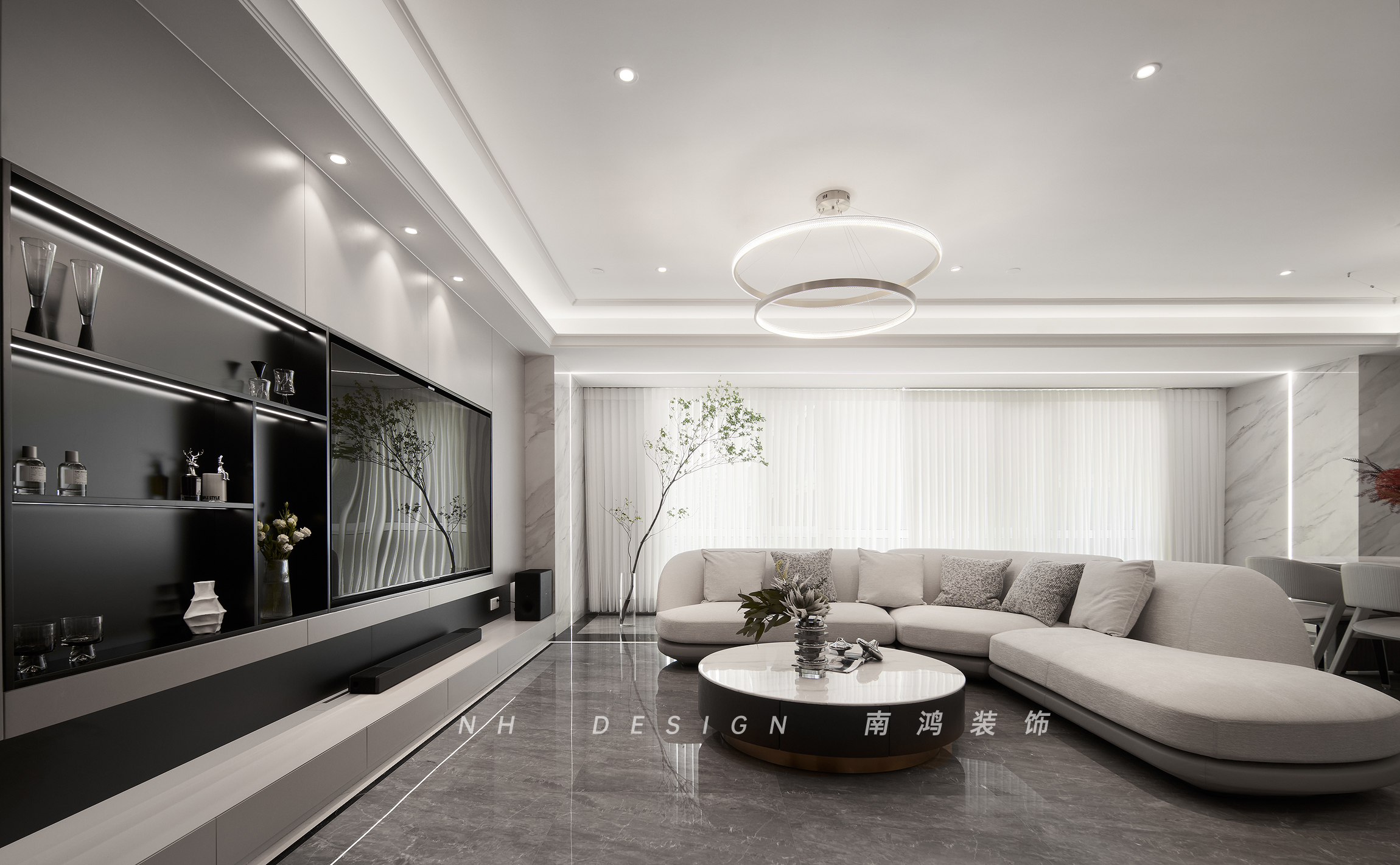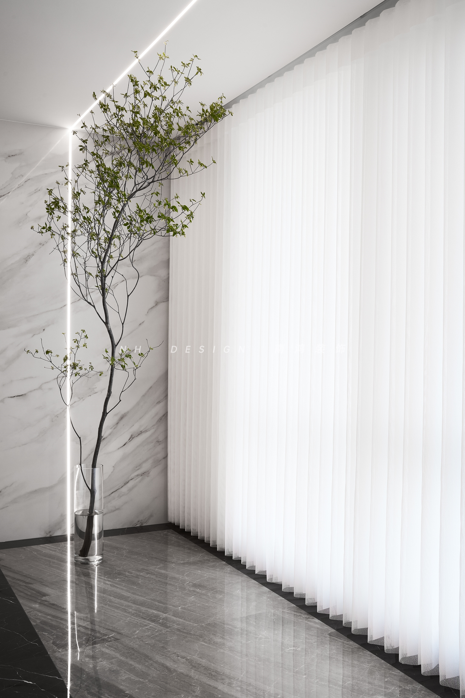 夢幻簾白凈的垂墜感營造出浪漫氛圍,搭配綠植和頂?shù)乩斐龅臒魩г煨?,細膩的情境設(shè)計傳達著美麗的生活愿想。