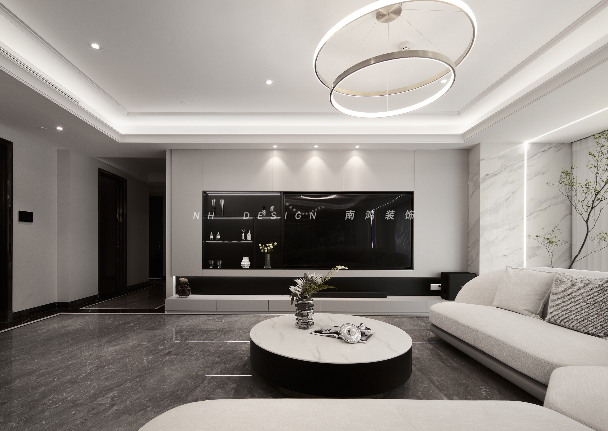 客廳使用淺色系的軟裝,造型穩(wěn)重大方。頂面做了“雙眼皮”疊級吊頂,有層次感的同時又不會影響層高,雙環(huán)形燈飾進一步增強區(qū)域光源和格調(diào)。