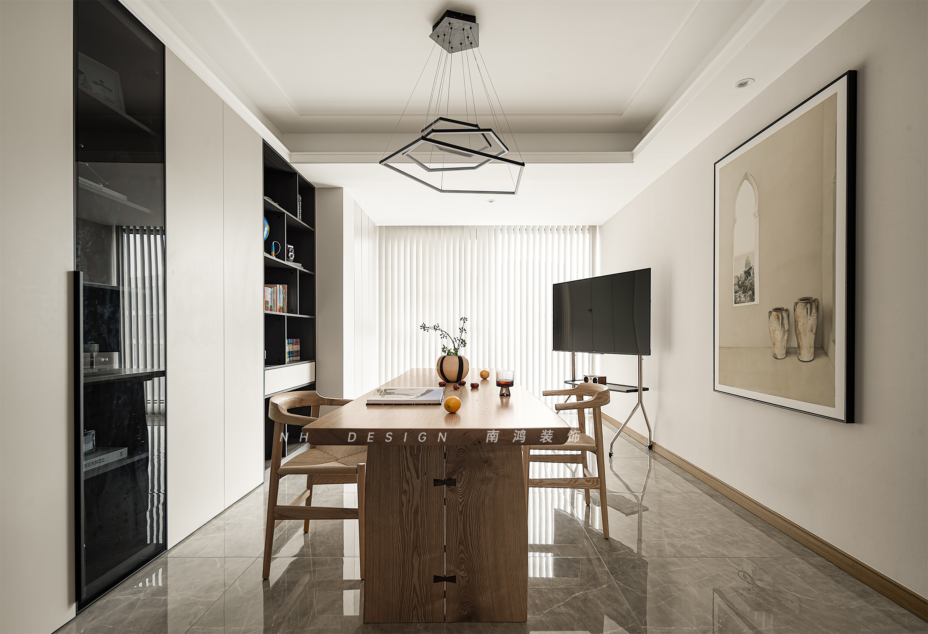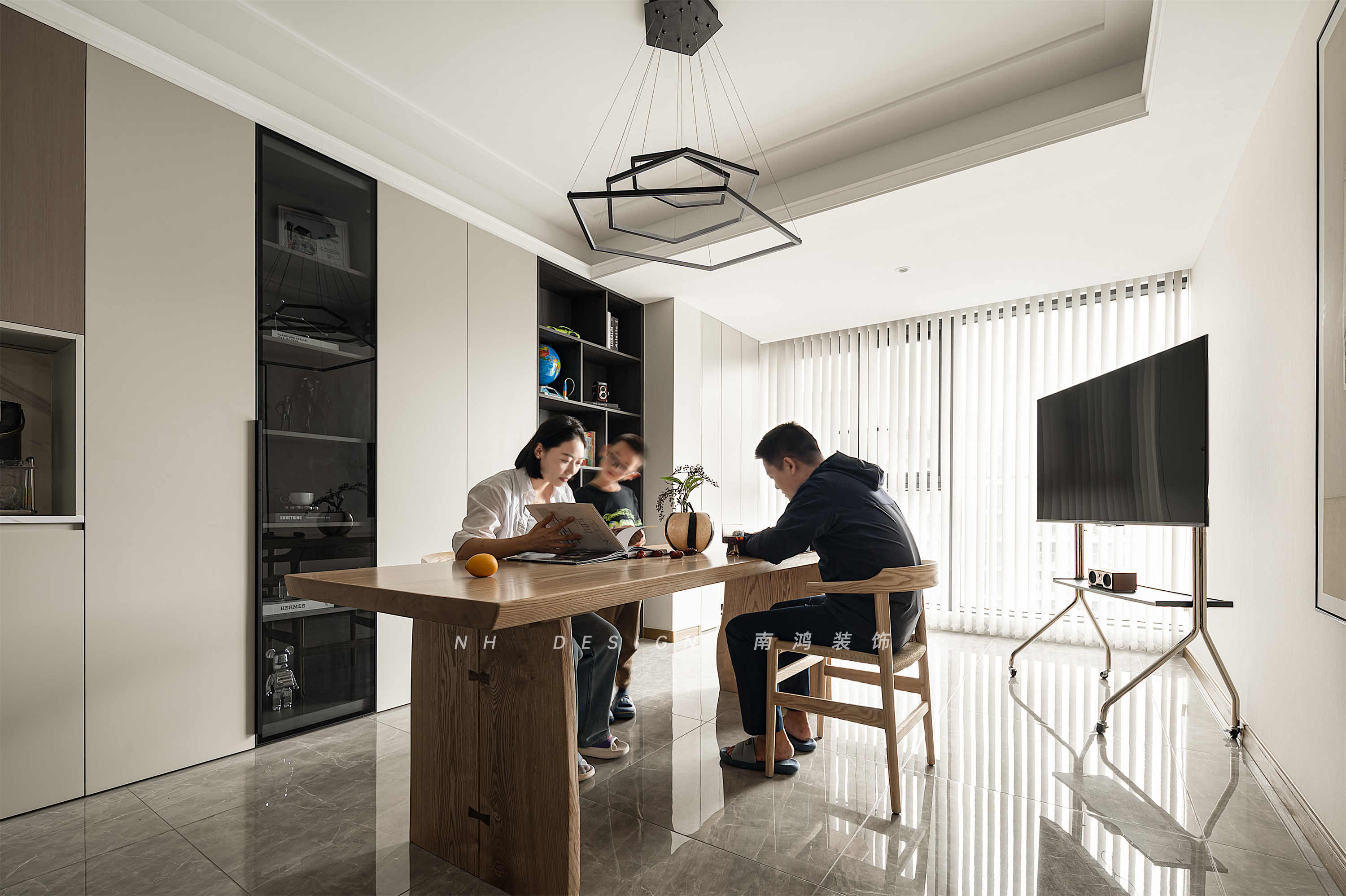 客廳在包進(jìn)陽臺(tái)之后,光感更加的充沛,夢(mèng)幻簾打造優(yōu)雅而浪漫的詩意。一張大板桌扮演著陪伴家庭共同成長(zhǎng)的角色,日升日落,平凡而溫馨的家常在這里無聲上演。可移動(dòng)式電視放置在角落,為偶爾的影音需求做好了準(zhǔn)備。