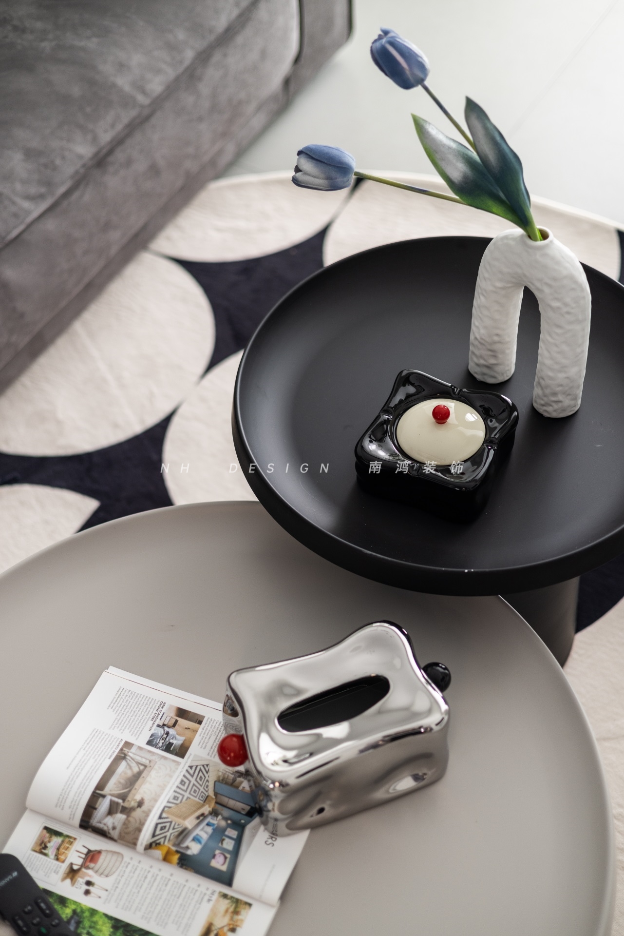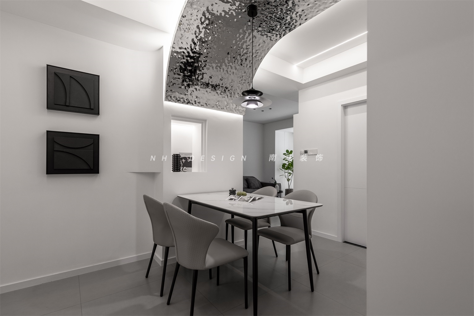 黑色的浮雕感裝飾畫(huà),墻面弧形的轉(zhuǎn)角以及小壁龕和燈線的處理,設(shè)計(jì)憑借幾何式的構(gòu)圖與黑白搭配增強(qiáng)了結(jié)構(gòu)上的秩序和層次感。