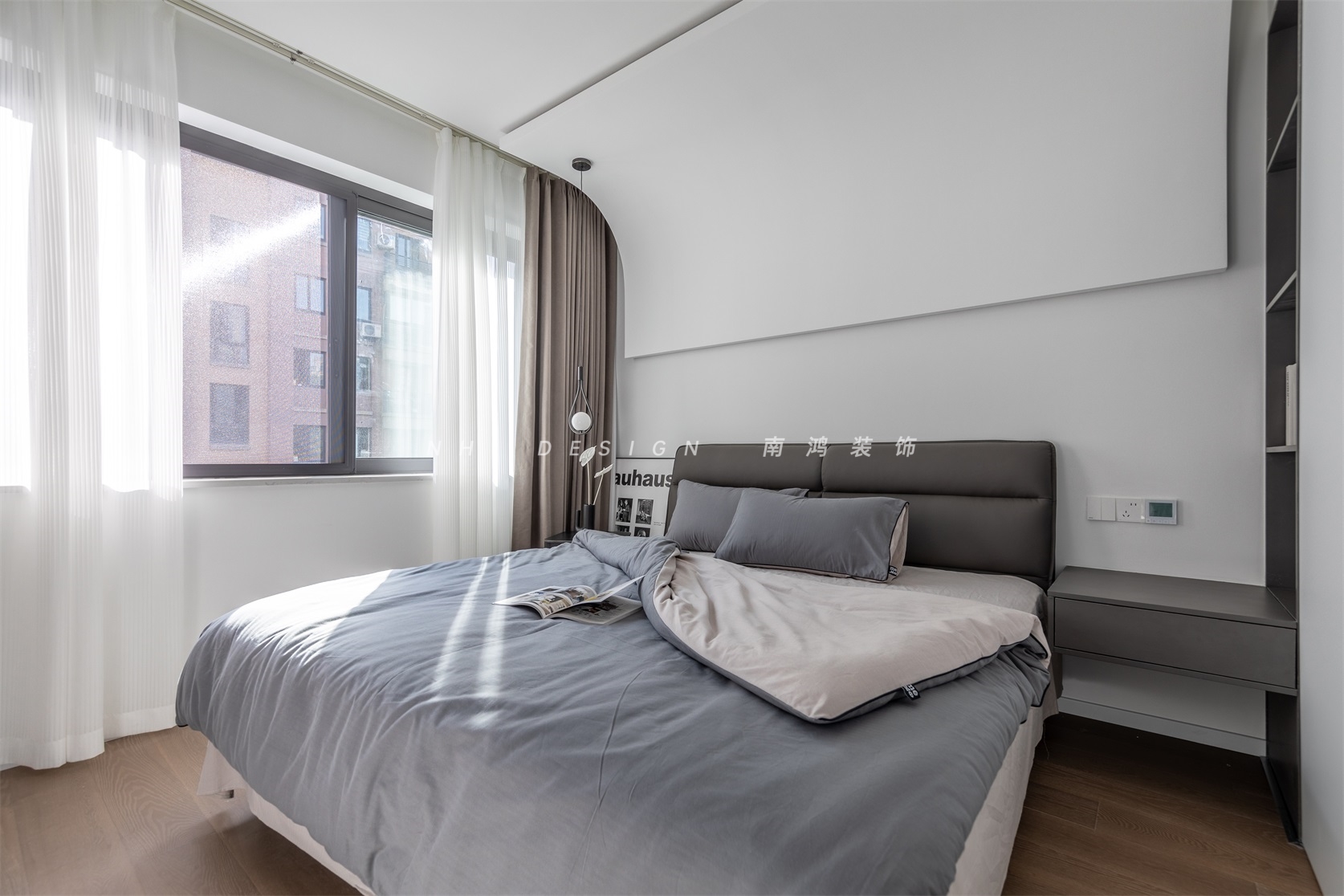 主臥延續(xù)全屋至簡(jiǎn)的黑白灰色調(diào),營(yíng)造純凈和通透的空間感。床頭背景由墻至頂設(shè)計(jì)了弧面的造型,視覺(jué)層次簡(jiǎn)約流暢,給予主人一份暖暖的安心感。
