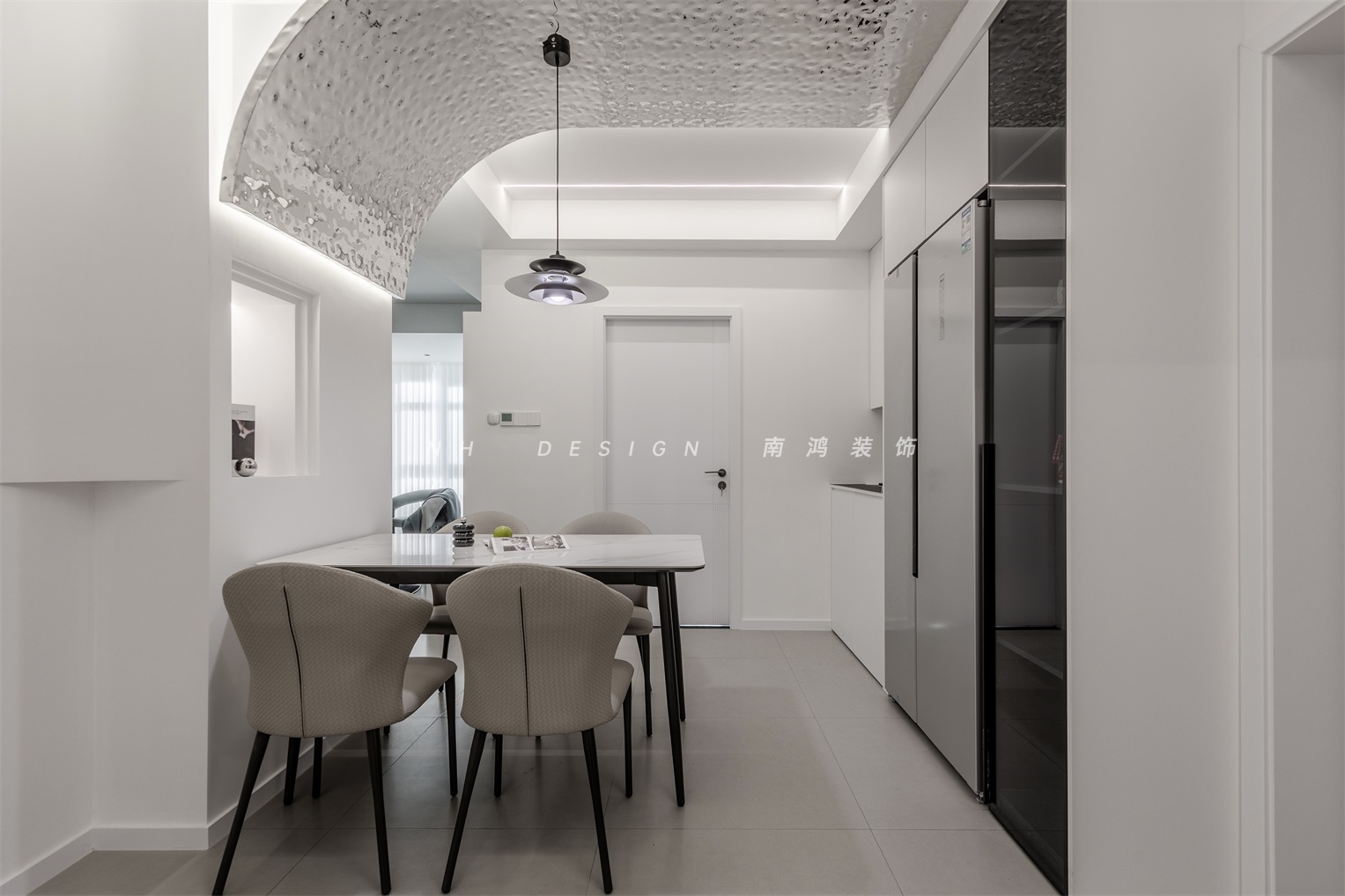 冰箱嵌入到了餐邊柜區(qū)域中,解放出廚房的空間,灰色的外表也契合整體的簡(jiǎn)約風(fēng)格。一組深色玻璃柜收納了業(yè)主的酒水,增強(qiáng)了餐廳的實(shí)用功能。