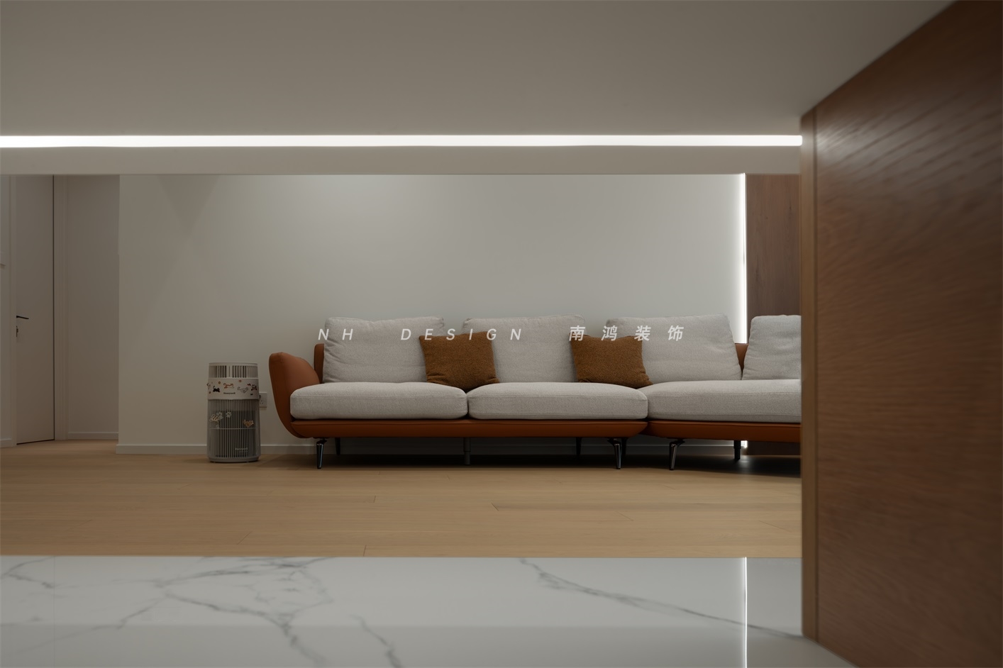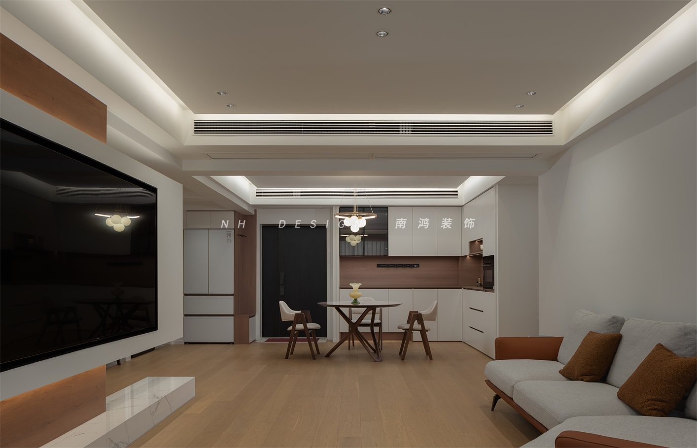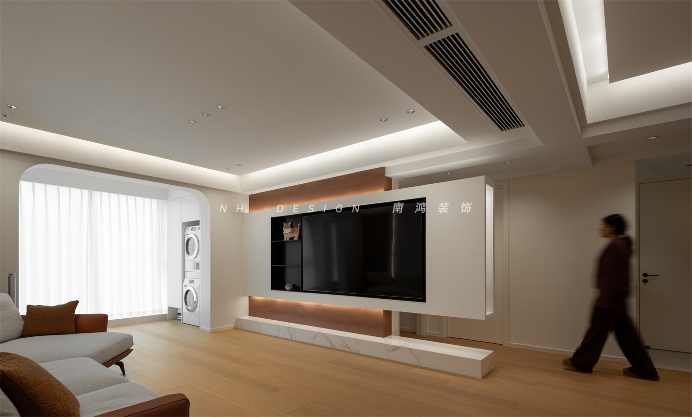 客廳電視背景墻以懸浮矩形姿態(tài)呈現(xiàn),輕盈地塑造出高級感,并與過道進行了趣味的結(jié)合,令公區(qū)域的通透性得到極大增強。