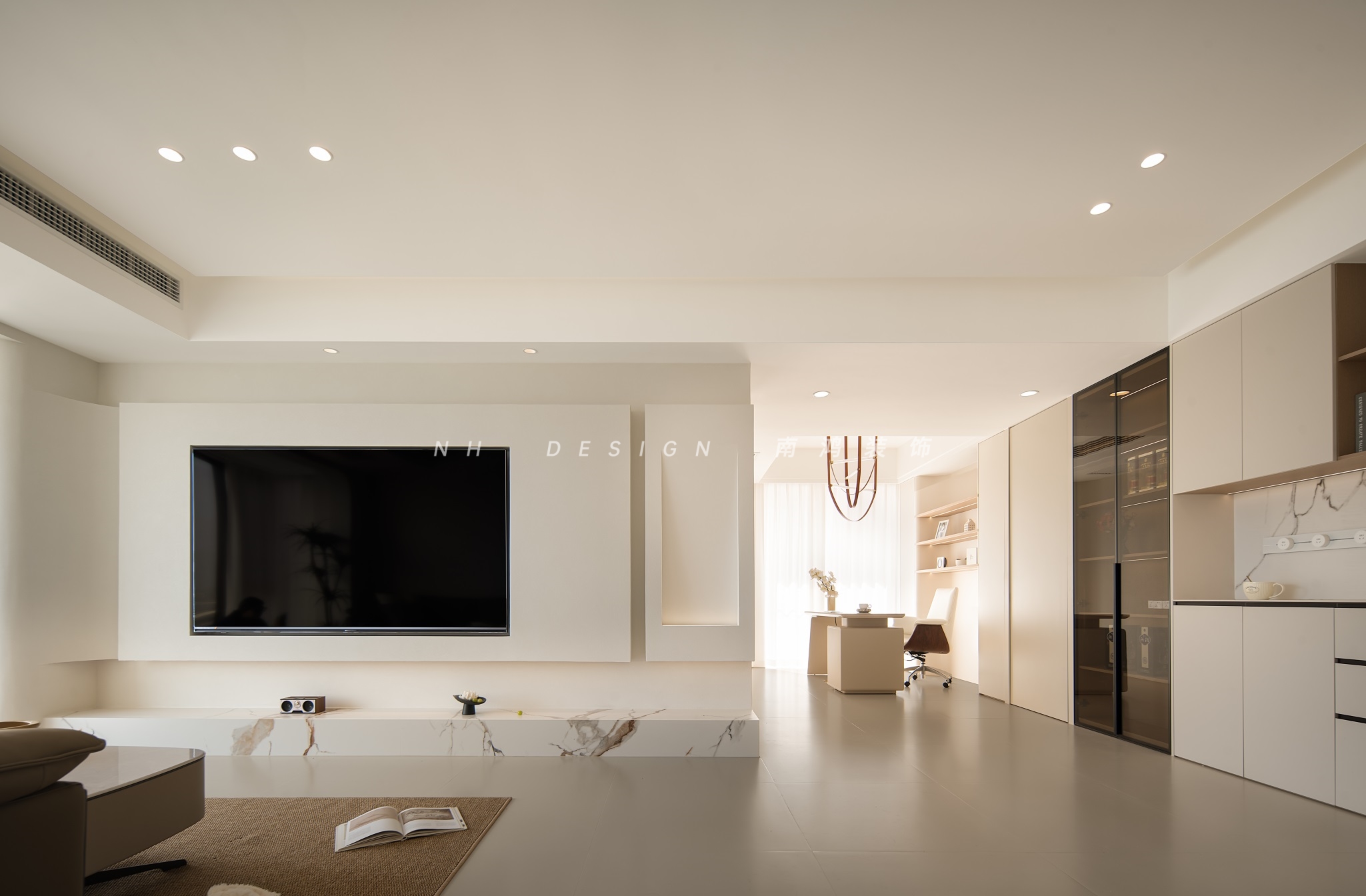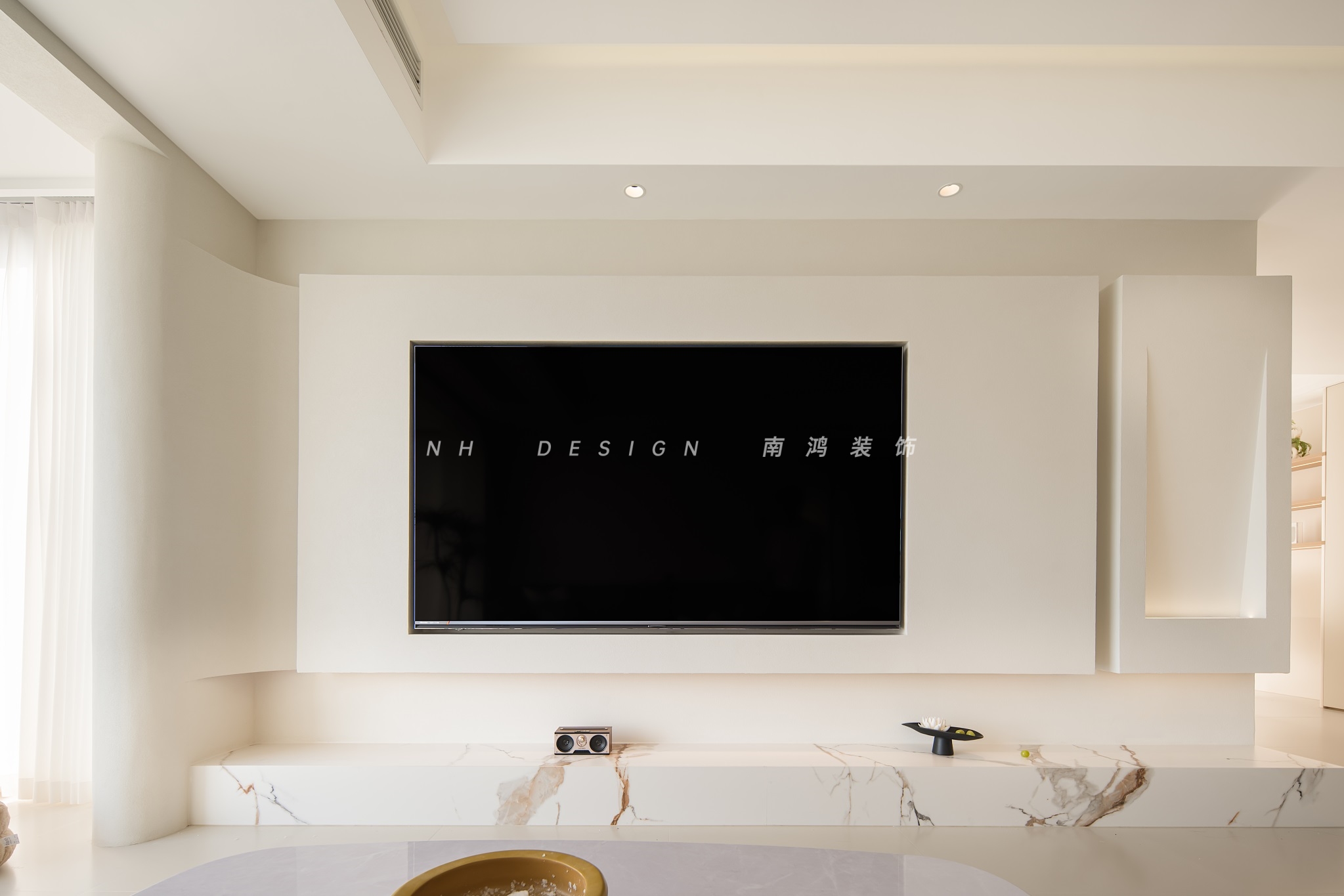 電視墻接續(xù)極簡語言,大面積留白做基底,通過弧形曲面、懸浮結(jié)構(gòu)與體塊分割的組合,構(gòu)建出輕盈而優(yōu)雅的空間表情。