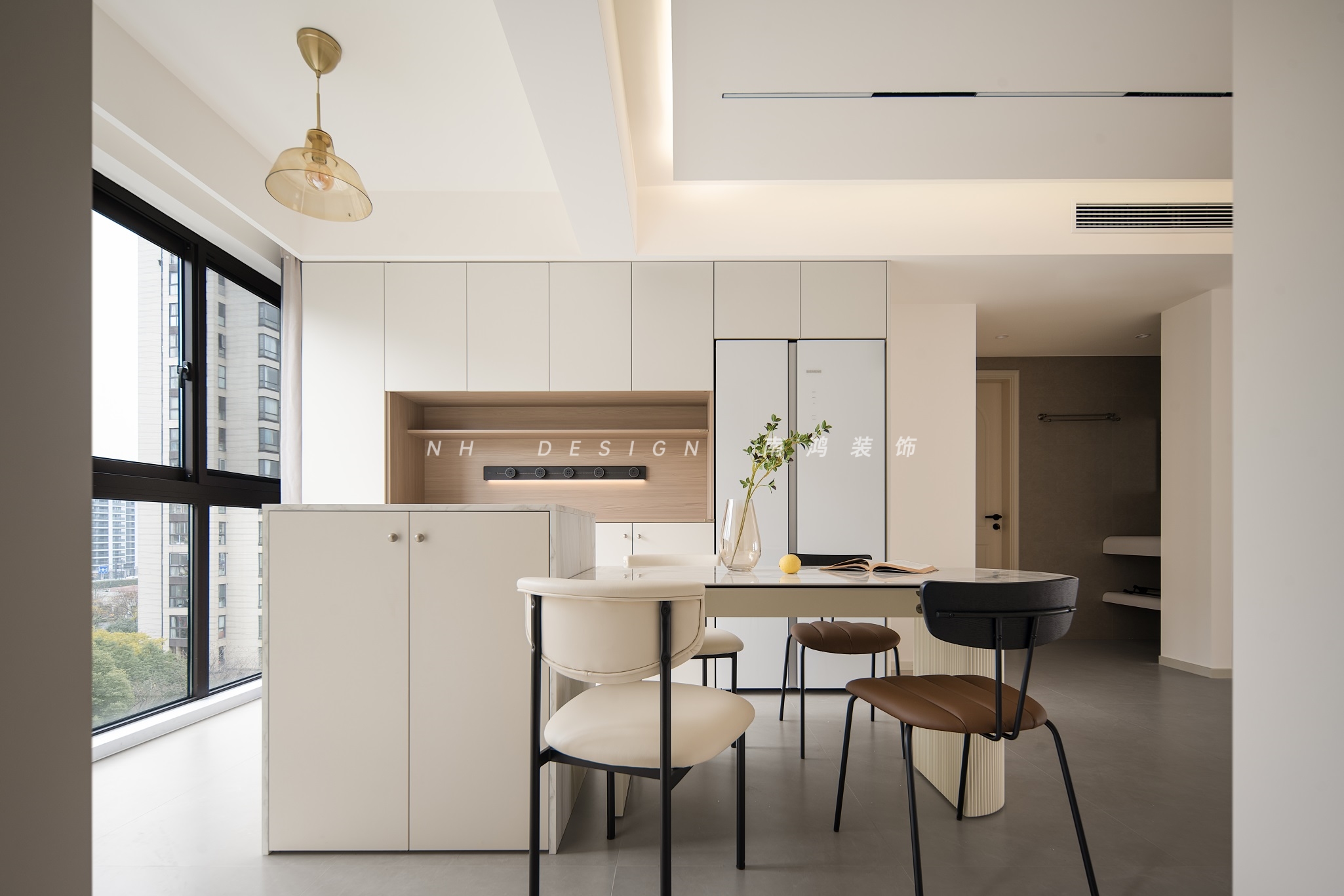 餐桌+島臺可以滿足日常用餐、備餐、小酌等多樣需求,西廚區(qū)納入冰箱,空間材質流動于白系、石面、木紋之間,勾勒全然通透的家屋景致。