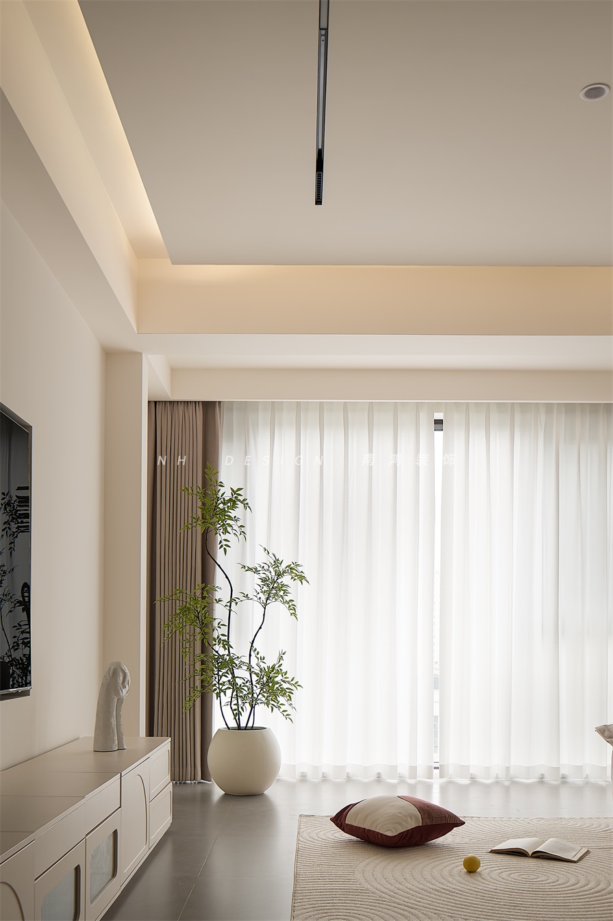 懸浮吊頂搭載無主燈設計,保持頂面視覺的純粹感,暗藏式的暖光暈染出柔和,與自然光線形成了冷暖平衡。